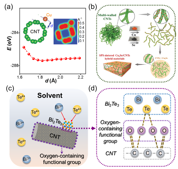d) Bi2Te3和碳纳米管通过表面含氧官能团成键复合。