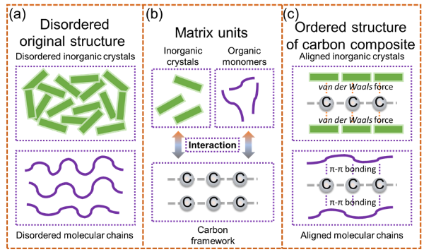 b)有机/无机热电材料的和高各向异性的碳同素异形体相互作用示意图。