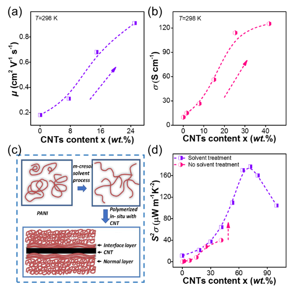 d)溶液处理前后,SWCNT和PANI复合材料的室温S2σ随CNT含量的变化。