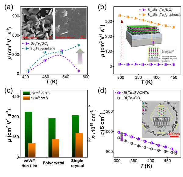 c)利用范德瓦耳斯力生长的Bi0.5Sb1.5Te3/石墨烯/SiO2/Si薄膜材料的载流子迁移率(μ)和载流子浓度(n)相比于Bi0.5Sb1.5Te3多晶和单晶。