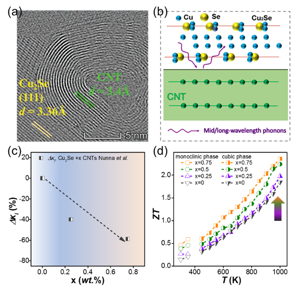 b)Cu2Se-碳纳米管界面强化声子散射示意图。