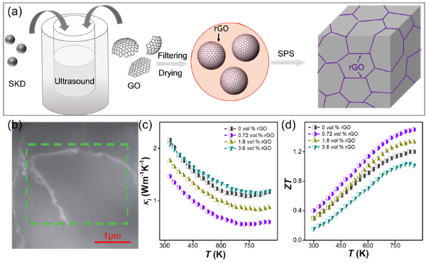 a)方钴矿热电材料复合还原氧化石墨烯限制晶体生长的示意图。