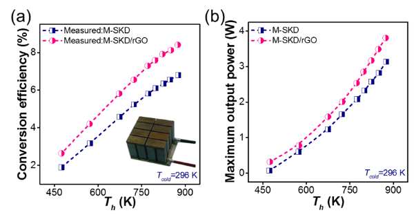 b)1.4 vol.%还原石墨烯复合的Ce0.85Fe3CoSb12和0.72 vol. %还原石墨烯和复合的 Yb0.27Co4Sb12两种材料组成的传统热电器件的最大输出功率。