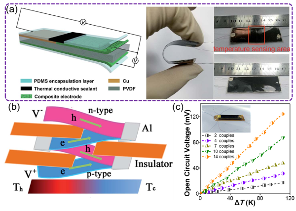 a)柔性温度敏感型压电传感器示意图和光学照片。