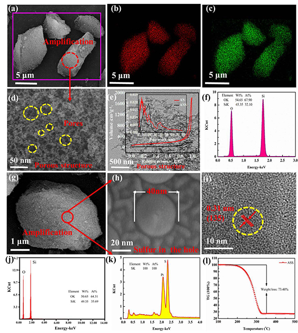 室温(RT)钠硫(Na/S)电池由于其适宜的工作温度、较高的理论能量密度和较低的成本,被认为是一种很有前途的储能系统。然而,较差的循环寿命和较低的可逆容量限制了其更广泛地应用。此外,在高工作温度下,高腐蚀性的熔融电极会导致严重的安全问题、高的维护成本和低的可靠性。寻找一种极好的电极材料来推进缓冲循环过程中的体积膨胀,和抑制多硫化钠扩散仍是至关重要的。非晶态二氧化硅(AS)是一种广泛应用的极性无机氧化物,具有孔结构复杂,孔容大,比表面积大,吸附能力强,具有良好的柔性性质。它由于具有特殊电阻的特性而被用作聚合物电解质中的添加剂。这些独特的性质使其成为在受限空间内吸附或固定相关分子的载体。