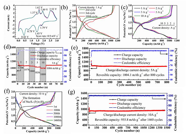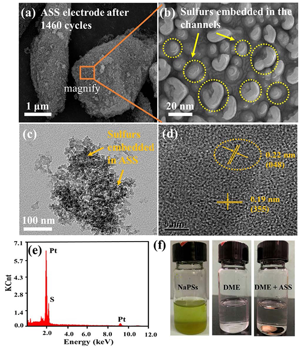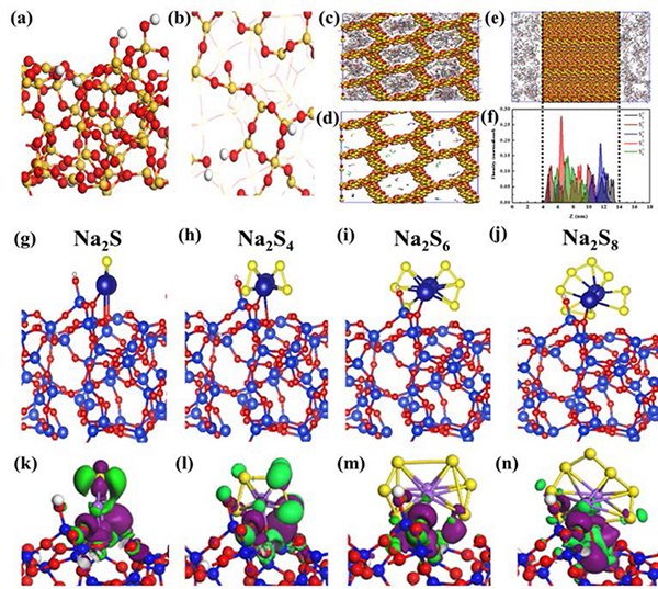综上所述,以非晶态多孔二氧化硅中的硫为正极,对先进的RT钠硫电池进行了测试。重要的是,二氧化硅独特的结构不仅可以提供相互连接的电子转移途径和短的钠离子扩散距离,而且还可以作为硫的宿主来抑制多硫化钠穿梭,从而获得足够快的充放电反应,并显示出优异的性能。制备的ASS电极在1、2、3、5和10 A gsulfur-1时的平均放电容量分别为1106、1074、1060、1036和1000 mAh gsulfur-1,即使在10 A gsulfur-1的大电流密度下,经过1460次循环,保持了近100%的库仑效率和955.8 mAh gsulfur-1的高可逆容量。通过MD模拟和第一性原理计算,揭示了微容器的固硫机理和AS与多硫化钠之间Na-O化学键的形成。用XPS、SEM和充放电后电极的多硫化物溶解,进一步证实了电极的结构。本研究为多孔二氧化硅固硫机理提供了一个基本的认识,并为先进的RT钠硫电池开发了一种很有前途的硫电极。