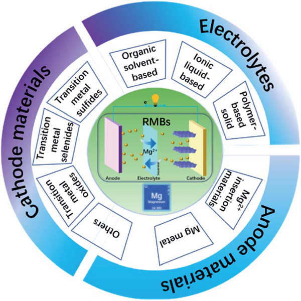 为有效利用太阳能、风能、潮汐能等可再生能源,储能是一个亟待解决的重要问题。在二次电池储能方面,相较于锂,镁具有低成本、环境友好、易于操作等优势。因此,可充电镁电池(RMBs)在实际应用中被认为是可充锂电池的绿色替代品。在过去的几年里,RMBs取得了很大的进展,但也存在许多问题。在此,中科院化学所郭玉国研究员等人从正极、电解质和负极三个方面综述了金属基复合材料的最新进展。阐述了正极结构对Mg2+迁移动力学的影响,简要介绍了各种用于RMBs电解质的性能和特点,并对金属镁及其它类型负极材料的改性进行了综合讨论。此外,还讨论了RMBs目前面临的挑战和未来发展的重要指导方针。