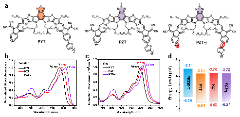 图1. 三种聚合物受体的化学结构及其相应的光电性质。