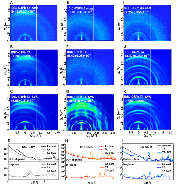 图3. 材料薄膜处理前后的GIWAXS二维图(A-C, E-G, I-K)和一维线图(D、H、L)