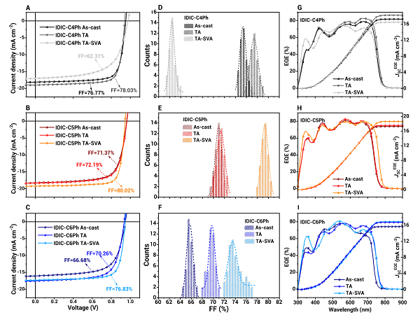 图4. (A-C) J-V曲线;(D-F) FF值统计图;(G-I) EQE曲线
