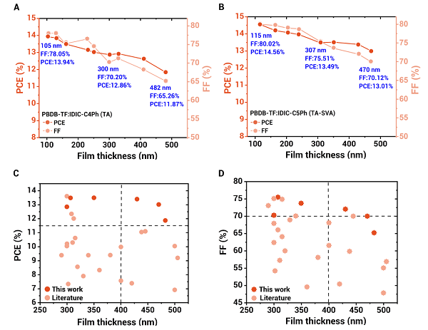 图5. (A、B)基于IDIC-C4Ph和IDIC-C5Ph的厚膜器件性能;(C、D)该工作与文献参数对比