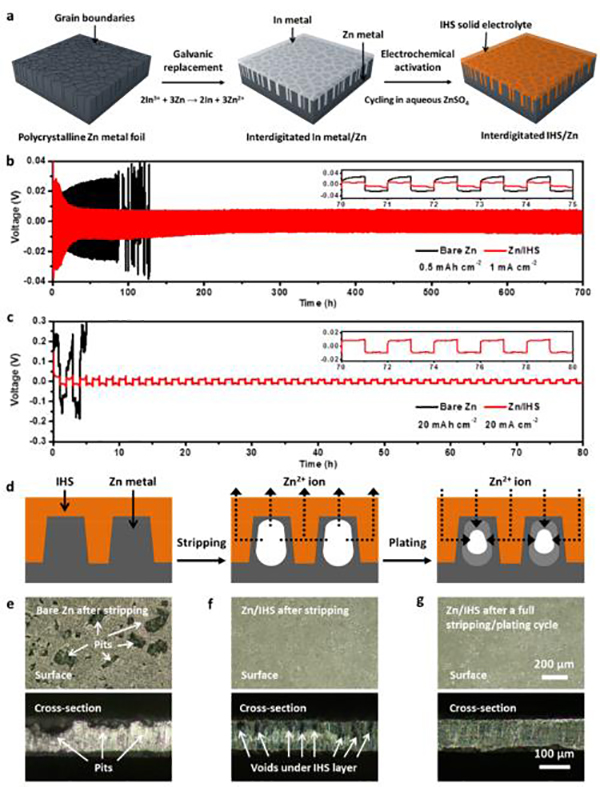 鉴于此,美国斯坦福大学崔屹教授和华中HTH官网地址 大学孙永明教授(共同通讯作者)报道了一种简单的置换反应制备三维叉指式金属锌/固态电解质复合结构电极,独特的三维叉指式结构抑制了电极循环过程中的表观体积变化,同时固态电解质避免了活性金属与水相电解液的直接接触以抑制副反应,由此实现金属负极高度电化学可逆。叉指式金属锌/固态电解质复合电极通过多晶金属Zn箔和InCl3的置换反应制备,置换的铟金属在锌箔表面沉积并通过晶界向体相扩散,形成三维叉指式结构。所沉积的铟金属在电化学活化过程中原位氧化为碱式硫酸铟基固态电解质,其具有较高的Zn2+导电性(56.9±1.8 mS cm-1),较大的Zn2+迁移数(0.55)和高的电阻率(2.08±0.01)×103 Ω cm-1。所设计的叉指式锌/碱式硫酸铟(Zn/IHS)基电极展示出稳定Zn沉积/剥离行为,在1 mA cm-2和0.5 mAh cm-2的条件下可循环700小时以上,且过电位仅为8 mV。此外,该Zn/HIS电极在20 mA cm-2和20 mAh cm-2的大电流密度和高面积容量下实现了稳定循环且过电位仅为10 mV,优于目前已报道的所有Zn金属电极。叉指式Zn/IHS电极的置换反应制备方法可扩展到其它金属对,例如Zn/Sn、Zn/Co,这为下一代具有高能量密度和长寿命的Zn金属电池设计提供了宝贵经验。相关研究成果以“A Replacement Reaction Enabled Interdigitated Metal/Solid Electrolyte Architecture for Battery Cycling at 20 mA cm–2 and 20 mAh cm–2”为题发表在J. Am. Chem. Soc.上。