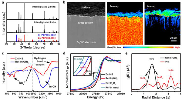 (a)Zn/In和Zn/IHS电极的XRD图,表明置换反应成功地将In金属引入Zn,并在电化学活化后变为非晶态;