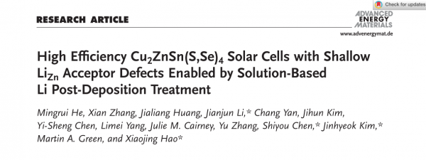1. Li, J., Huang, Y., Huang, J., Liang, G., Zhang, Y., Rey, G., … & Green, M. A. (2020). Defect Control for 12.5% Efficiency Cu2ZnSnSe4 Kesterite Thin‐Film Solar Cells by Engineering of Local Chemical Environment. Advanced Materials, 32(52), 2005268.