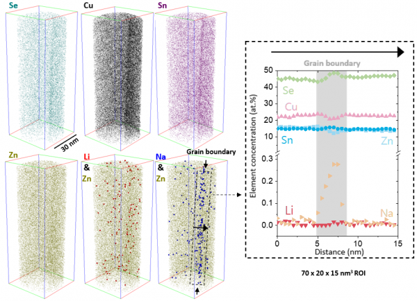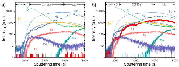 a) CZTSSe和b)锂掺杂的CZTSSe太阳能电池的元素分布