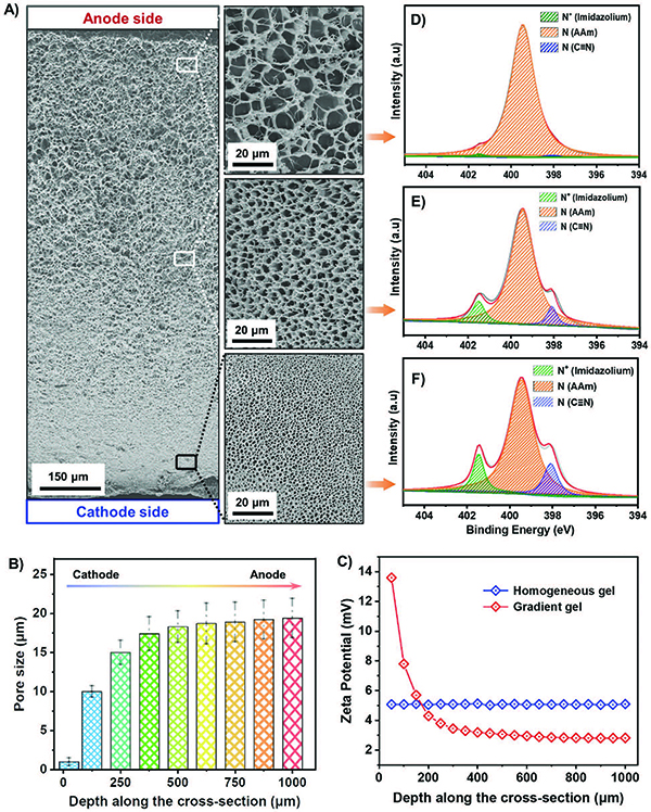 (A)冷冻干燥的梯度离子凝胶从阴极到阳极的横截面SEM图像;