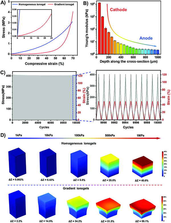 (C)梯度离子凝胶的循环压应力-应变疲劳测试;