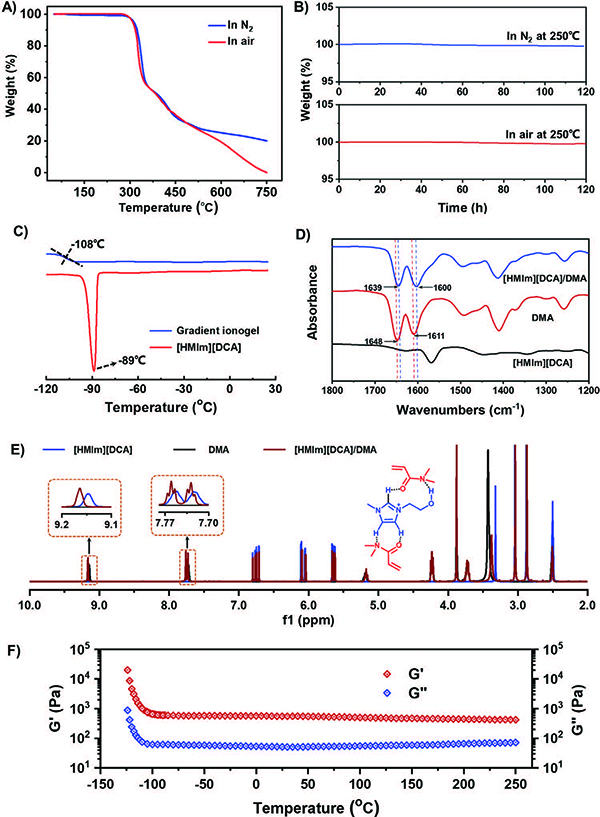 (B)梯度离子凝胶在N2和空气中,在250℃下的长期耐用性;