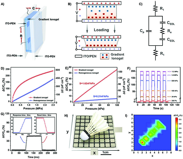 (A)基于梯度离子凝胶的离电子传感器的压力-电阻响应曲线;