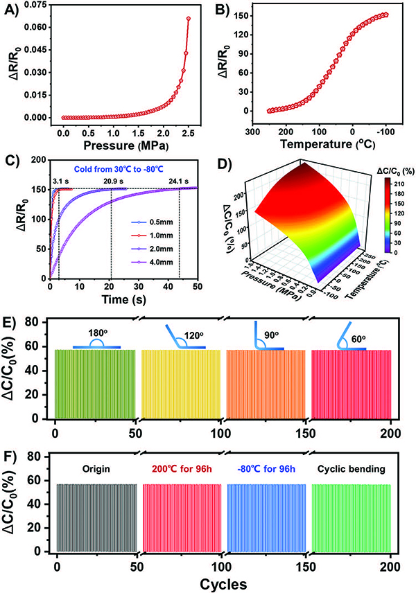 (E,F)梯度离子凝胶压力传感器在静态弯曲(弯曲角度:60°、90°、120°和180°)和循环弯曲(90°弯曲100次)和长时间高/低温(200℃/80℃)后的性能。