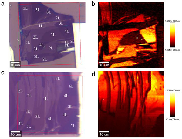 (b,d)分别对应于(a)和(c)中区域的SHG空间映射;对于不同的层,SHG信号的强度是不同的;在奇数层PdSe2中,SHG信号几乎不存在,而在偶数层PdSe2中则很强。