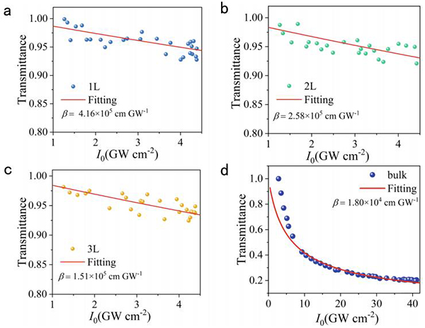 (d)块状PdSe2的非线性透射率;蓝点表示实验结果,而实心红线表示使用TPA模型拟合的结果。块状PdSe2的TPA系数(β)为1.80×104 cm GW-1。