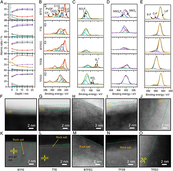 (A)使用不同LHCEs循环后NMC811正极上CEIs中不同元素在不同深度的XPS原子比;