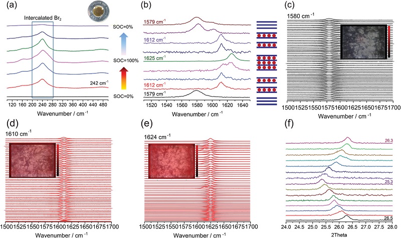 e)在充电后,1阶段Br-嵌入PGA正极的拉曼光谱图和相应的峰;