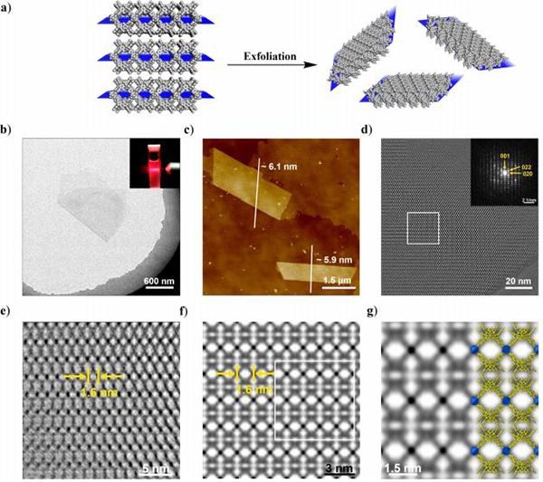 金属-有机骨架(MOFs)是一类重要的结晶多孔固体材料,在众多领域具有潜在的应用前景。二维(2D)MOF纳米片(MONs)具有暴露更充分的活性中心、超薄的特性和更快的传质等优点,已成为二维纳米材料家族中一个新成员。人们非常关注在平面内含有周期性排列的本征空隙的二维MONs,因其在高选择性催化、分离和传感等领域具有广阔的应用前景。在各种已报道的方法中,通过将三维层状MOFs进行剥离来制备二维MOF纳米片是一种有效的方法,但由于三维层状MOFs结构的局限性,有序本征孔隙的MONs合成仍然存在一定困难。因此,其合理设计合成和局部结构表征仍然充满挑战。