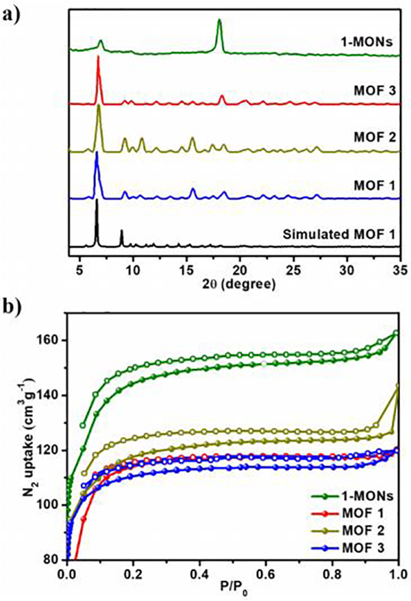 (a)三个MOFs和1-MONs的PXRD图谱;