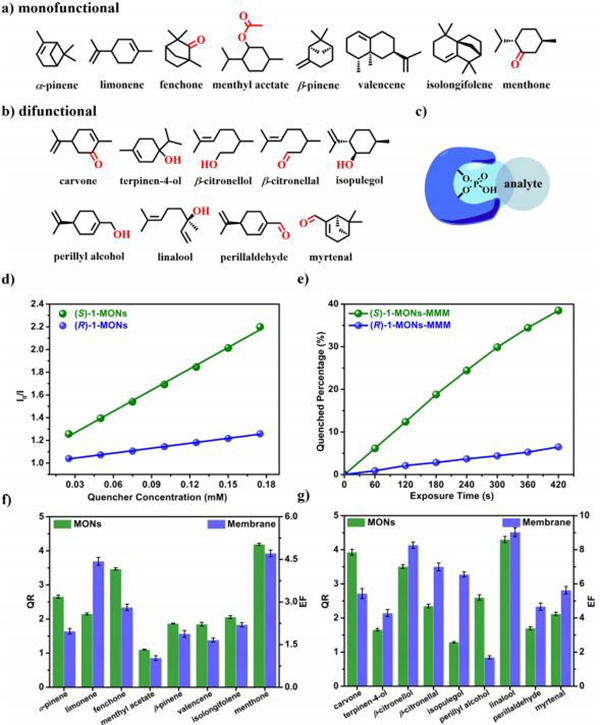 综上所述,本文报道了基于1,1’-联苯骨架的三种手性多孔三维层状Ln-MOFs的设计和合成,该骨架在3,3’-位置上具有疏水性的均三甲苯基团。由于层间较弱的相互作用,块状Eu-MOF晶体容易剥离成2D超薄单晶纳米片(两层)。同时通过低剂量HRTEM技术,在MOF骨架中清楚地观察到有序的孔道、配体和金属节点。研究人员将获得的1-MONs-MMM用作荧光传感平台,以实现对萜烯和萜类化合物良好的选择性和高灵敏度的检测。