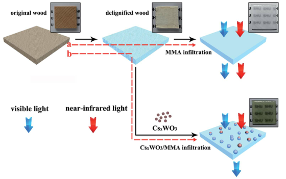 文献链接:Transparent wood containing CsxWO3 nanoparticles for heat-shielding window applications