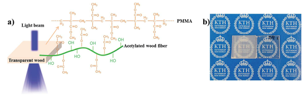 图2 (a)改性高透明木材结构的示意图;(b)非乙酰化透明木材(左)和乙酰化透明木材(右)。
