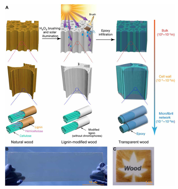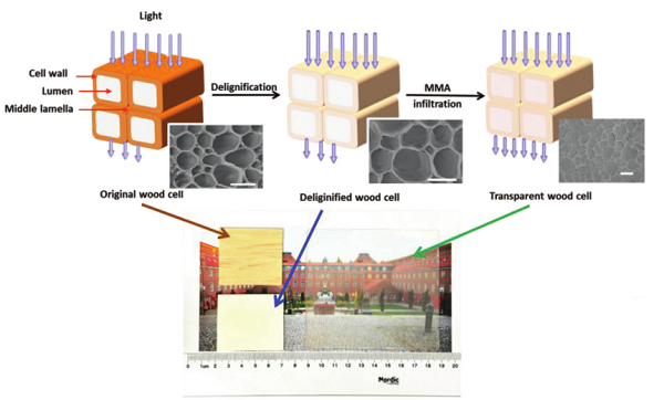 透明木材是一种多功能木质复合材料,关于透明木材的第一份报道来源于Fink公司于1992年编写的木材形态学研究。后来,通过将机械性能与光学透射率研究相结合,提出了透明木材在工程相关领域的应用。由于在基本木材特性基础上增加了光学透射率,透明木材有助于木材解剖学研究,还可用于透光智能建筑、电子设备,以及光伏电池和光源等光子设备。