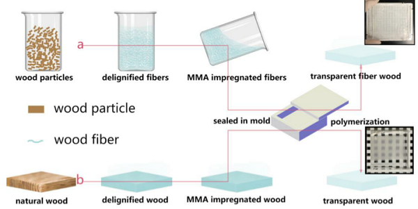 图7 通过去除木质素和随后的聚合物渗透制造具有高光学雾度的透明木材的示意图。