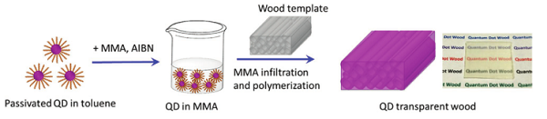 包含活性荧光材料的功能光转换层是许多器件中的必要组件。瑞典皇家理工学院Ilya Sychugov团队通过用富含量子点的甲基丙烯酸甲酯渗透木材模板,成功制造了结合光学和承载功能的发光透明木材。在这一转变过程中,没有检测到光学退化的迹象,表明量子点与封装用透明木材基质间良好的相容性。木质结构引入了强散射,导致嵌入量子点的漫射发光,这对于平面光源和发光建筑构件或家具是有利的。木材细胞壁的表面改性将有助于调节这种新材料的光散射特性,使其具有更广泛的应用前景。