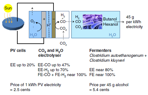 针对这一问题,德国西门子公司的Guenter Schmid(通讯作者)团队[1]利用了可商用的银基气体扩散电极。该电极通常使用在工业规模的氯-碱电解过程中,而研究人员则以此电极作为二氧化碳电解槽的阴极。检测发现,由此形成的电解槽在超过1200小时的连续运行后,电流密度依然可高达300 mA cm–2。这一二氧化碳电解槽可被连接到发酵模块(fermentation module),这样一来,从电解槽出来的合成气可以直接转化成具有高碳选择性的丁醇和己醇。研究计算显示。光伏电能、二氧化碳和水转变成醇类的法拉第效率可接近达到100%。利用这一杂化系统,研究表示人工光合成高价值化学品(丁醇/己醇)可能达到几万吨每年的产量,已经接近工业化规模水平。