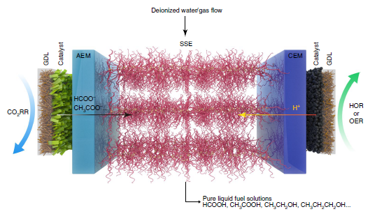 2. Continuous production of pure liquid fuel solutions via electrocatalytic CO2 reduction usingsolid-electrolyte devices. Nature Energy, 2019, 4, 776-785.