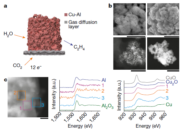 乙烯的生产同样也需要解决成本的问题。在二氧化碳电还原过程中,铜催化剂对于制备多碳产物展现出了巨大的优势。然而基于铜催化剂的二氧化碳电还原制乙烯的能量效率和产率(电流密度)目前依然无法满足工业化要求,由此生产的乙烯仍不具备有市场竞争力的价格。卡内基梅隆大学的Zachary Ulissi和多伦多大学的Edward H. Sargent(共同通讯作者)等人[6]描述了一种铜铝电催化剂,并利用DFT和主动机器学习结合的方式进行研究。计算研究表明,铜铝合金能够为接近最优化的一氧化碳结合提供多样化位点和表面取向,从而实现高效、选择性地二氧化碳还原。更重要的是,原位X射线吸收测量揭示了铜和铝可促进优化铜的配位环境,增强碳碳键的二聚化。与纯铜实现的66%左右的法拉第效率相比,该研究在400 mA cm−2处实现了超过80%的法拉第效率(1.5 V vs RHE),这一高效率打破了乙烯的法拉第效率记录。这些结果也说明,计算和机器学习能够指导多金属催化剂体系的实验探索,从而有望突破传统单金属催化剂的限制。