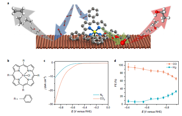 多伦多大学的Edward H. Sargent(通讯作者)课题组[3]提出了一种分子-金属催化剂表面的协同催化剂设计。这一设计旨在建立富含反应中间体的局部环境,从而提高从二氧化碳和水电合成乙醇的能力。研究人员首先利用一系列能够催化二氧化碳形成一氧化碳的卟啉基金属复合物对铜表面进行功能化,再利用DFT计算和拉曼、X射线等谱学表征,发现局部一氧化碳展现出高浓度特点,能够有利于碳碳耦合、控制反应路径以高效生产乙醇。验证实验的结果,二氧化碳-乙醇转变的局部电流密度也达到了(124 mA cm−2)(−0.82 V vs RHE),但由于抑制氢气生成的问题没有解决,其法拉第效率略有下降(41%)。这一催化剂后又被集成到薄膜电极组装系统,也实现了13%左右的全局能量效率。