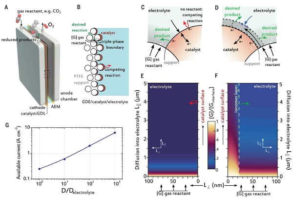 二氧化碳电化学还原产生C2化学品的另外一个挑战是生成的气体都是疏水的,而产物反应又需要水分子的参与。气体往往需要扩散穿过液态电解质与催化剂表面接触,这也限制了C2生产能力的进步。为了克服这一问题,多伦多大学的Edward H. Sargent和David Sinton(共同通讯作者)合作[4]将离子聚合物(ionomer)组装体和铜电催化剂结合形成新型3D催化剂。这一复合催化剂具有离子聚合物体相异质结(CIBH)结构,能够分离气体、离子和电子输运。这一结构包含金属层和超精细离子聚合物层,其中离子聚合物层进行了疏水和亲水功能化,能够组装形成结构差异化的形貌,并有利于气体和离子在金属表面的输运:气体传输可通过疏水区域的侧链进行提升,使气体扩散得以扩展;同时,水的吸收和离子出现在亲水区域。由此带来的结果是,活性位点附近的气体反应物、离子和电子大幅增加,反应界面由亚微米尺度提升到了几个毫米水平。以此为策略设计的催化剂在7M磷酸盐电解质中实现了高效的二氧化碳电还原反应,乙烯的局部电流密度可以到达1.3 A cm−2(阴极能量效率为45%)。这一电流密度是迄今为止在二氧化碳生产C2化学品过程中观测到的最高值,已经可以完全满足工业规模相关的应用需求。