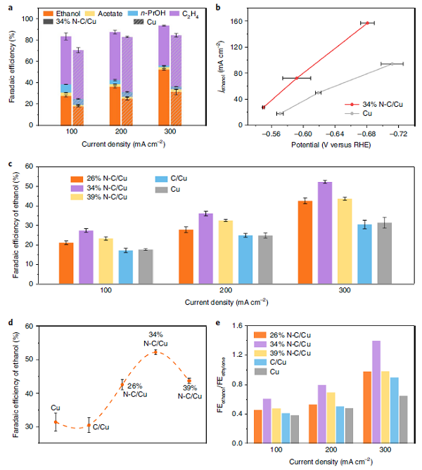 而在二氧化碳电还原反应中,乙醇和乙烯是两种主要的C2竞争产物。一般认为,这两种产物衍生自共同的关键中间体(HOCCH*),HOCCH*中碳氧键断裂产生了乙烯。对二氧化碳电还原反应进行技术经济分析发现,只有当局部电流密度超过100 mA cm−2时,C2产物才会开始产生经济效益。这意味着即使二氧化碳电还原反应的全局电流密度超过10 mA cm−2,乙醇产物的法拉第效率需要进一步提高才能推进商业化。Edward H. Sargent(通讯作者)的团队[5]报道了一类可实现52%左右乙醇法拉第效率和31%乙醇阴极能量效率的催化剂。研究发现,在铜表面涂覆氮掺杂碳层,赋予了催化剂强大的供电子能力,可以在HOCCH*中提高碳碳键的耦合、抑制碳氧键的断裂,从而增强二氧化碳电还原过程中的乙醇产物选择性。根据该研究的数据,利用氮掺杂碳层改性后铜催化剂在电流密度超过100 mA cm−2时的总法拉第效率高达83%,乙醇的法拉第效率也大幅提高,超过了已有报道的最佳数值(41%)。