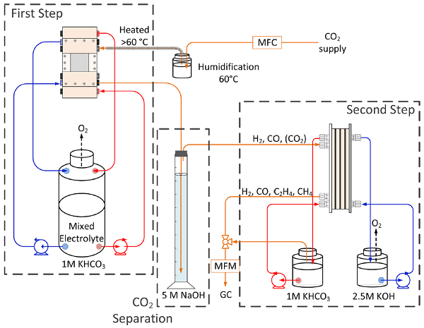而近期,西门子公司的N. S. Romero Cuellar(通讯作者)等人[7]提出了一种新型的两步电解法,展示了其工业化前景。作者利用两块分别以银和铜作为气体扩散电极的液流电池,将两步二氧化碳电化学还原过程进行集成化。在这一集成系统中,作者实现了电解质、气体和电极之间的巨大三相边界区域,由此可以在工业级电流密度水平操作运行电化学还原过程。作者首先利用电压/电流密度变化线扫分别研究两个电解槽;而在分析第二个电解槽时,作者假定供应第一步的二氧化碳不会全部转化成一氧化碳,即第一步的产物气体是一氧化碳/二氧化碳的混合气。以此假定,作者研究了不同比例混合气的电还原反应,并发现二氧化碳的占比越高一氧化碳转换成多碳产物的效率越低。因此,作者在第二步中用氢氧化碳吸附二氧化碳,从而有效增加集成系统的全局法拉第效率。根据计算,这一两步策略的多碳产物(C2和C3)累计法拉第效率可以达到62%。