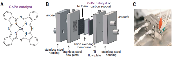 在近期,巴黎大学的Marc Robert和英属哥伦比亚大学的Curtis P. Berlinguette(共同通讯作者)等人[8]将可商用的酞菁钴催化剂固定到与镍泡沫OER催化剂串联的气体扩散碳层上,由此形成的液流反应器能够通过以下两个方面实现更高的电流密度:一方面克服了电解过程的质量传输问题;二方面是能够往阴极上供应二氧化碳以解决二氧化碳在溶液介质中的低扩散问题。凭借这一策略,研究在薄膜液流反应器中展示了酞菁钴基分子催化剂介导的二氧化碳-一氧化碳转化,其在150 mA cm−2处的选择性可达到95%以上。