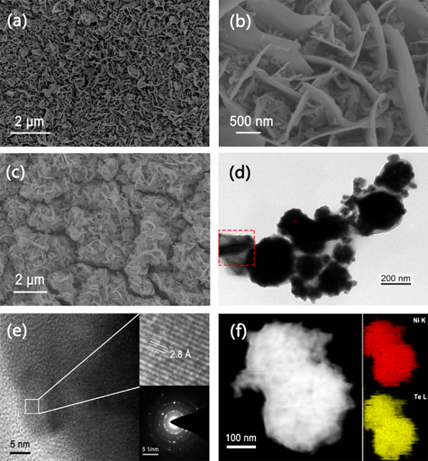 (a-b)NiTe2纳米片在不同放大倍数下的扫描电镜图片,垂直取向的纳米片有利于电解液离子在材料表面的快速传输和扩散,同时增加了材料的比表面积。