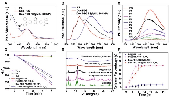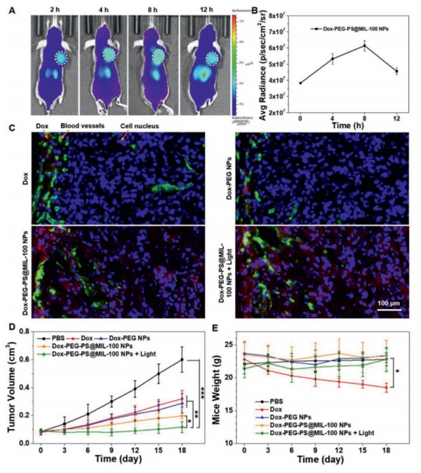 具有良好肿瘤穿透的抗癌药物在瘤内的有效分布对于光动力(PDT)与化疗联合治疗具有重要的现实意义。新加坡国立大学刘斌报道了金属有机框架(MOF)辅助策略,对聚集诱导发光光敏剂(AIE PS)和化疗药物的进行了智能递送,进而实现了肿瘤深穿透和高效的成像引导光动力-化疗联合治疗。其中,新型AIE PS被封装在铁基金属有机骨架(MIL-100)中,以生产PS@MIL-100,后经阿霉素(Dox)共轭相连的聚乙二醇(PEG)包覆为直径为120 nm的Dox-PEG-PS@MIL纳米颗粒(NPs)。在Dox-PEG-PS@MIL NPs到达肿瘤部位后,肿瘤内H2O2引起负载的PS于肿瘤表面释放,实现可激活的光动力疗法(PDT);同时触发Dox-PEG片段自组装为超小型Dox NPs。光照下,PDT在肿瘤表面被激活,协同增强超小型Dox NPs的瘤内穿透。 Dox NPs被癌细胞摄取后,Dox于低pH环境中从Dox NPs释放进入细胞核,从而进行高效的化疗。同时,PS发出远红外/近红外光,实现了成像引导的增强型光动力-化疗联合治疗。该成果以题为“Tumor-Activated Photosensitization and Size Transformation of Nanodrugs”发表在Adv. Funct. Mater.上。