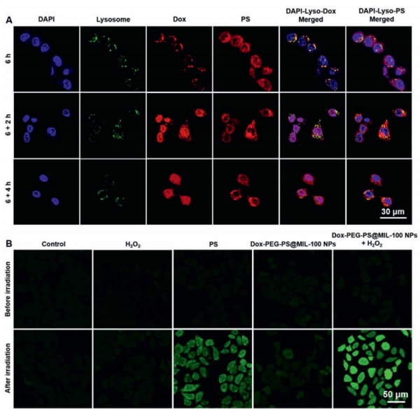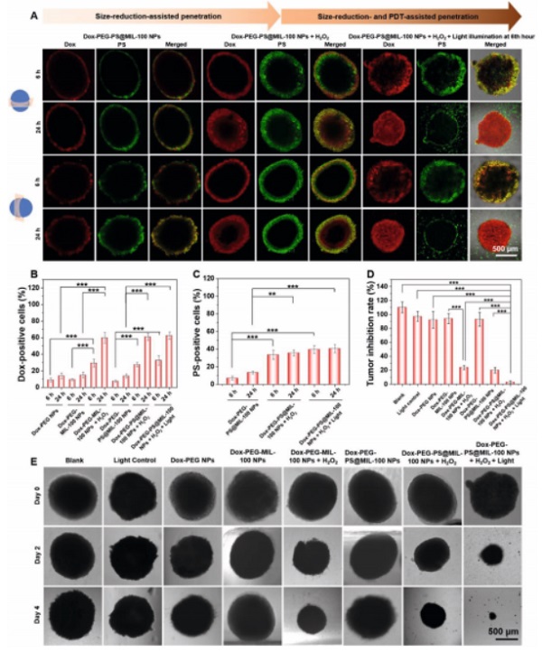 A)Dox-PEG-PS@MIL-100 NPs的MIL-100结构坍塌 (I),PS释放(II)和Dox-PEG自组装(III)以及纳米颗粒尺寸减小和PDT辅助的肿瘤深穿透;B)I,II和III过程后,Dox-PEG-PS@MIL-100 NPs的敏化和尺寸减小的双重激活,以实现瘤内深穿透,从而进行高效的成像引导的光动力-化疗联合治疗