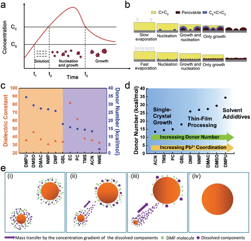 b)在缓慢和快速溶剂蒸发下,从前驱体溶液中生长的钙钛矿晶体的成核/生长竞争模型;