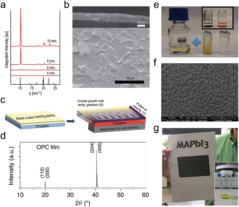 c)通过刮涂工艺制备的MAPbI3钙钛矿薄膜的热梯度辅助定向结晶过程示意图;