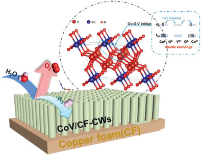 氢气具有能量密度大、使用过程无污染、无温室气体排放等优点,是推动能源技术革命的重要能源载体。电解水制氢技术是氢循环的关键环节,但常见电催化剂缓慢的载流子传输过程使得电解水制氢的效率低,难以满足应用需求。有鉴于此,我们提出在廉价CoO电催化剂中引入Co-V-O桥键,通过自旋翻转跳跃过程减小电荷传输能垒,提升电催化分解水性能,如图2所示。这种含有Co-V-O桥键的催化剂可生长在不同导电基底上,使得这类催化剂具有极高的实用价值。相关成果发表在材料领域顶级期刊Advanced Functional Materials上,李忠涛教授、吴明铂教授和南开大学胡振芃教授为共同通讯作者,中国石油大学(华东)为第一署名单位。